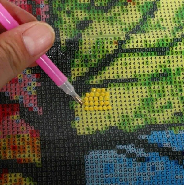 Incluye: lienzo plástico numerado, con pegamento incorporado, gemas plásticas coloridas, cada sobre tiene la indicación donde deben ser aplicadas, siempre traen de mas, bandeja para posicionarlas, cera para el lapiz y poder adquirir la adherencia, lapiz aplicador